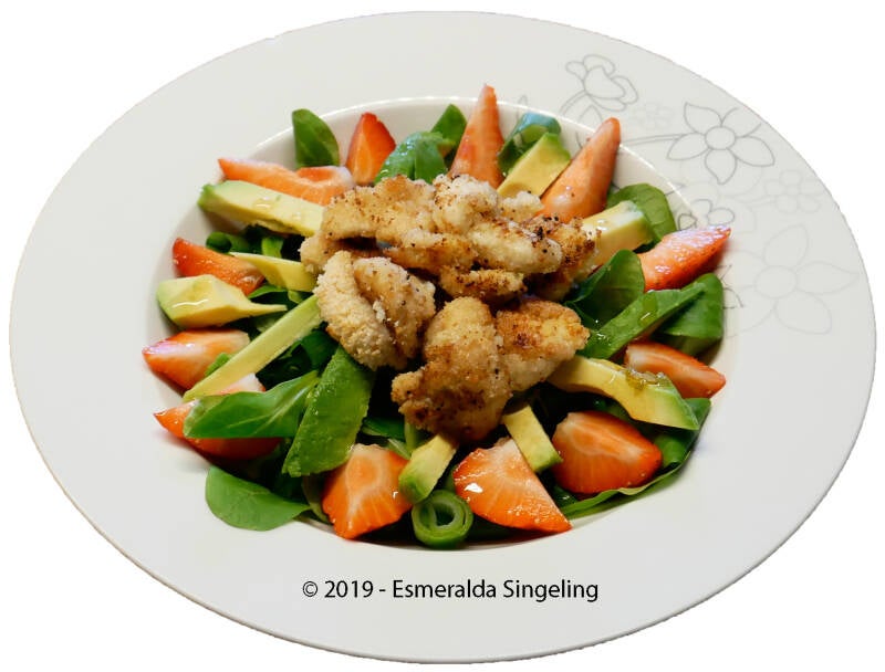 Aardbeiensalade met avocado en krokante kip