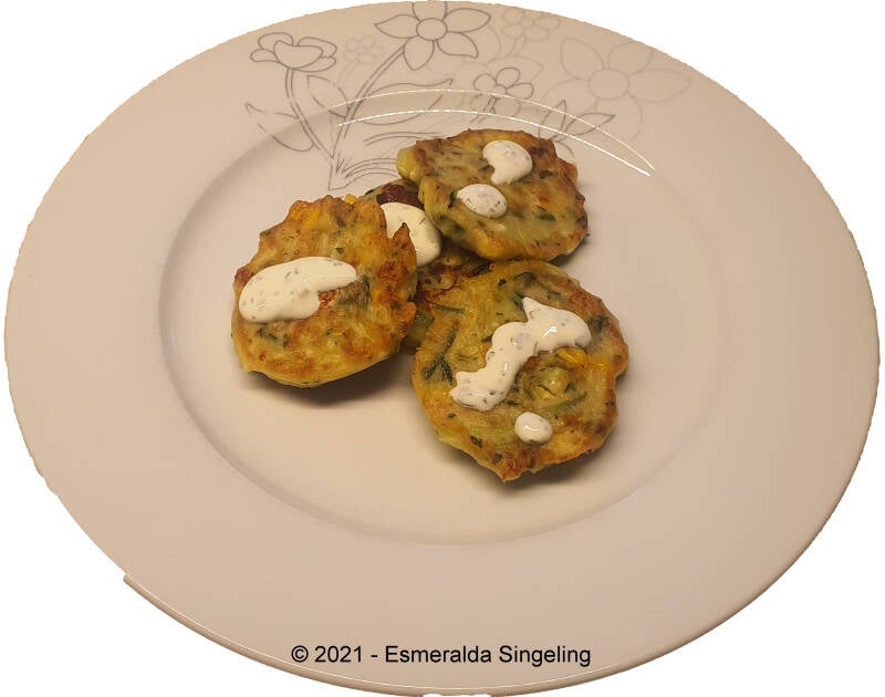 Mais-courgettekoekjes met dip en veldsla