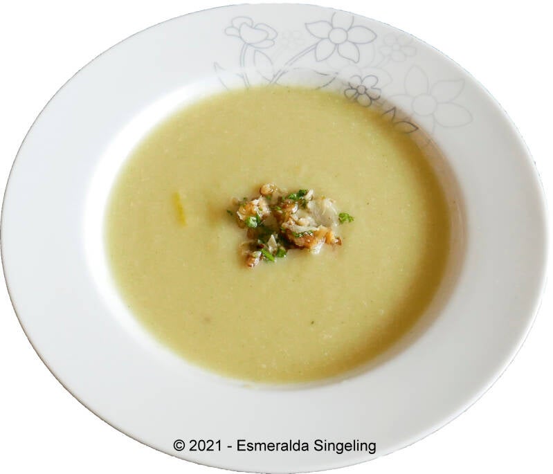 Pureer de soep met een staafmixer en breng de soep op smaak met peper en zout. Serveer de soep en garneer met de citroen-walnoottopping.